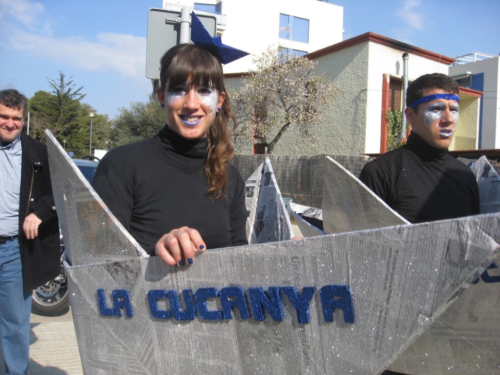 La carrossa era un gran vaixell de paper empurpurinat de blau i a la comparsa, cada persona portava també un vaixell de paper amb purpurina platejada sobre base negra de jersei i leggings.