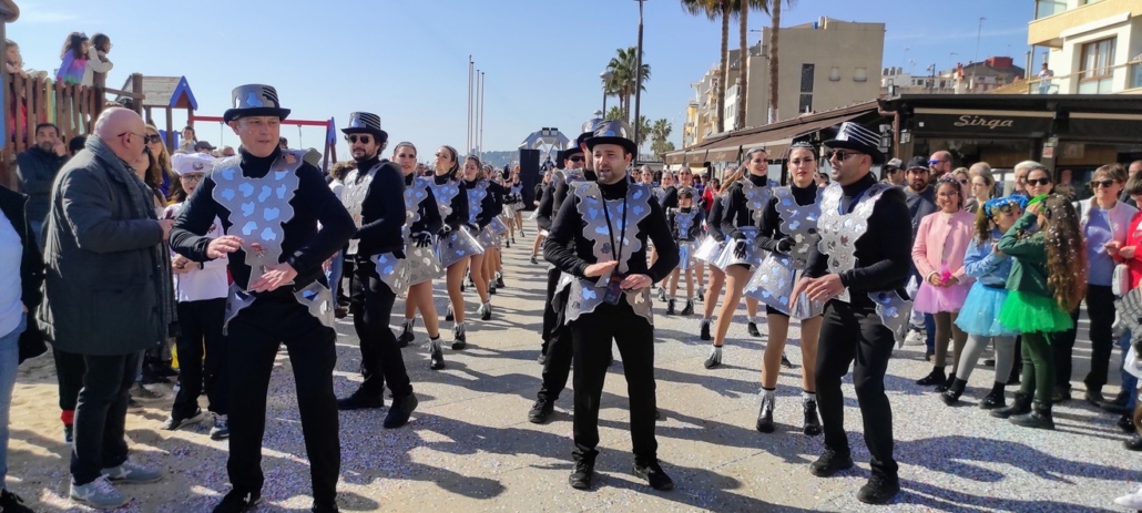 Els nois portàvem el mateix coll que les noies sobre una base de mobo negre mentre que els pantalons, també de color negre, anàven acompanyats amb una cintura d´acetat i goma eva, rivetejada amb brillants transparents. Un barret de copa folrat amb una base d´acetat, goma eva i brillants tancava el cap dels nois.