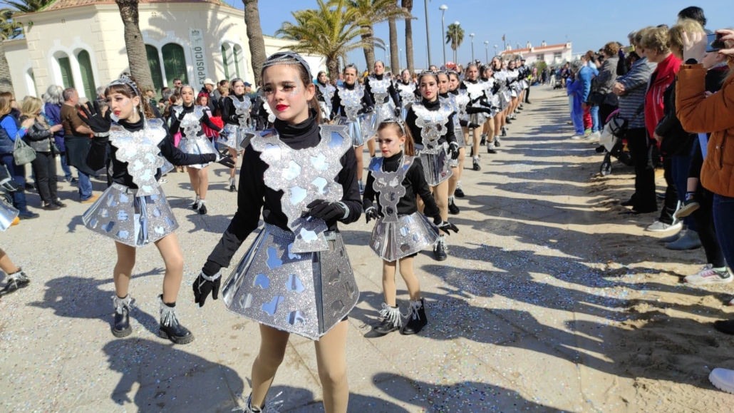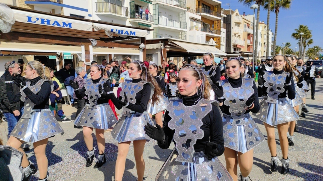Les noies portàvem una faldilla formada per una base d’acetat i decorada amb goma eva de color gris empurpurinada, tota rivetejada amb brillant transparent. A la part superior, un coll fet de foam, acetat i goma eva, de nou, tot rivetejat amb brillants transparents. El cap el culminava una diadema amb fils de brillants que decoraven la part frontal del cap i es barrejaven amb els cabells de les noies. El calçat eren botins guarnits amb serrells formats per brillants transparents.