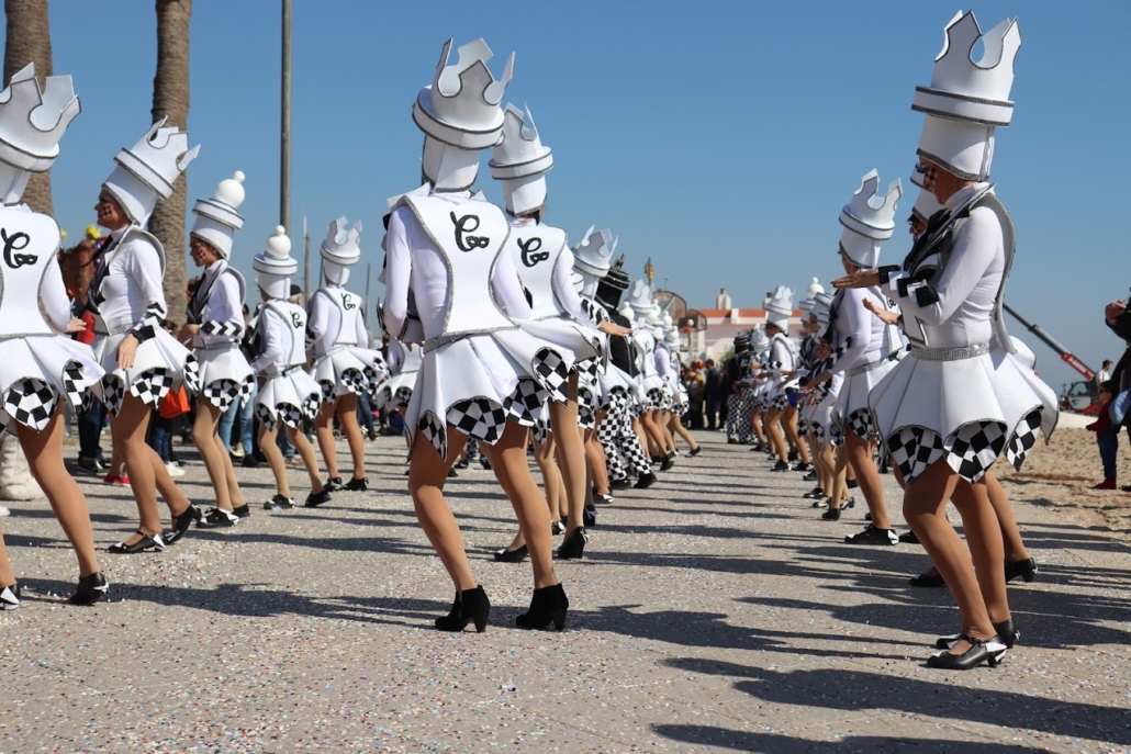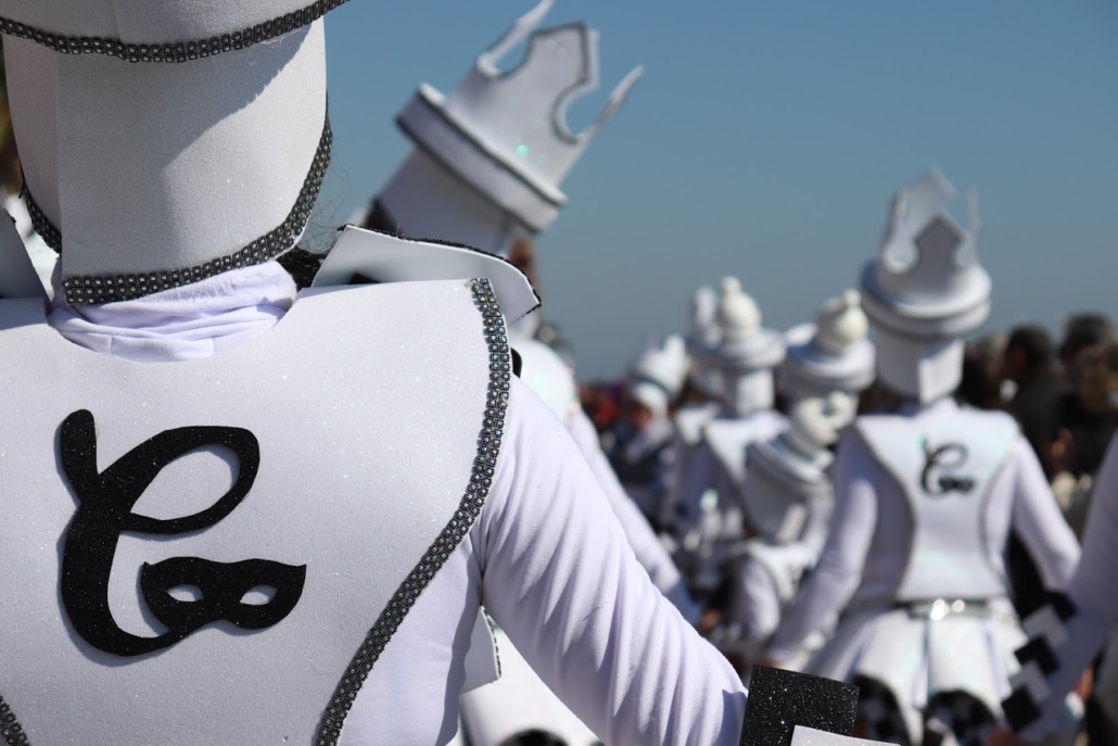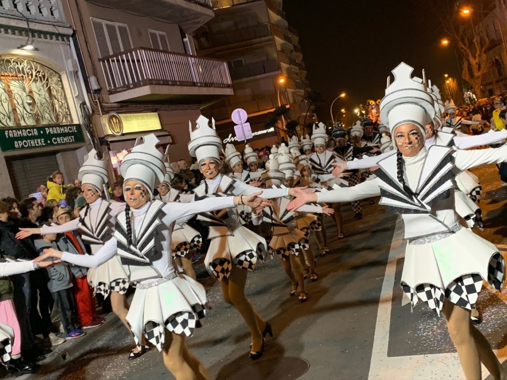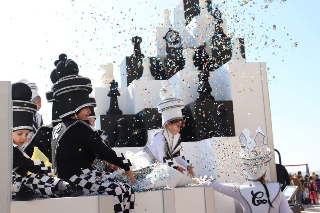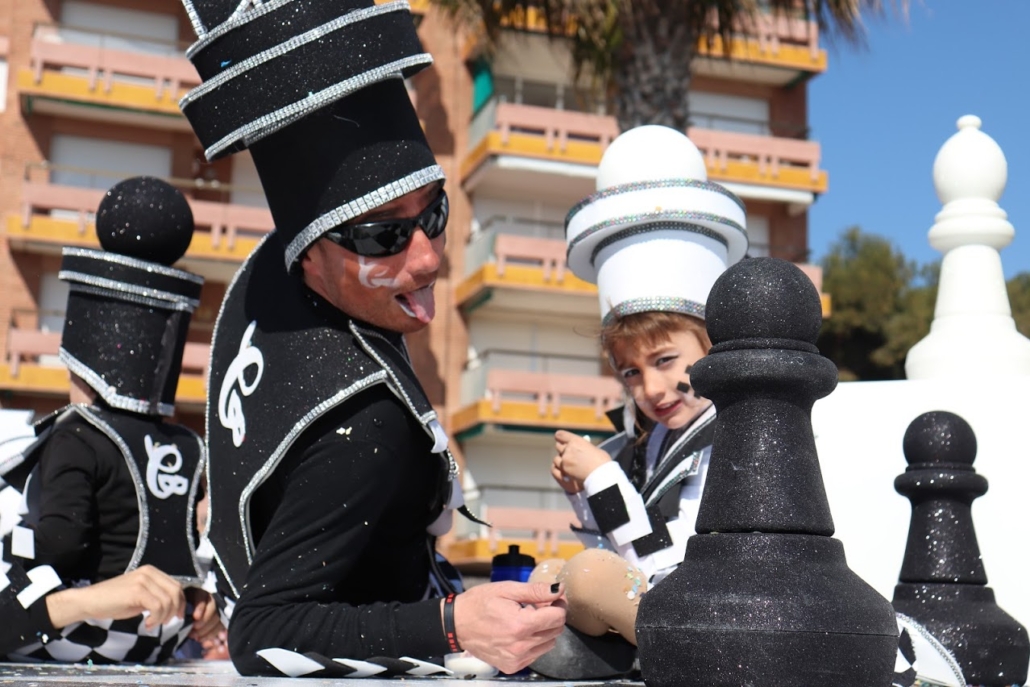 Carrossa i disfressa inspirades en els escacs. Les noies portàvem una faldilla formada per cons de goma eva empurpurinada de color blanc, amb l’interior folrat amb tela de quadres blancs i negres, simulant el taulell d’escacs.