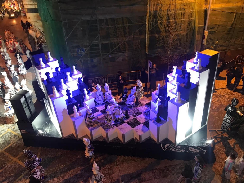 La carrossa estava inspirada en un taulell d´escacs en format 3D elevant verticalment els quadres fins als extrems – davant i darrera – on arribaven a la seva alçada màxima. Les peces empurpurinades de blanc i negre completaven la decoració.